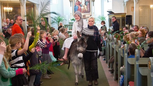 Vi synger påskesalmer og - sange og vi hører påskens spændende historier. Vi ser Jesus ride ind på æselet.